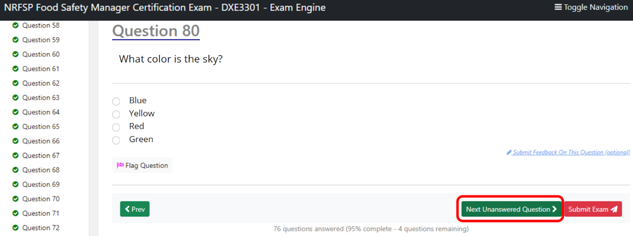 The examinee can select Next Unanswered Question or manually review flagged or skipped questions.